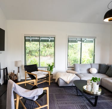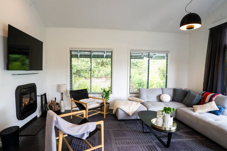 The Lounge room with a cosy, wood burning fireplace, wide, comfy sofa and relaxing lounge chairs and a big screen TV with complimentary Netflix.